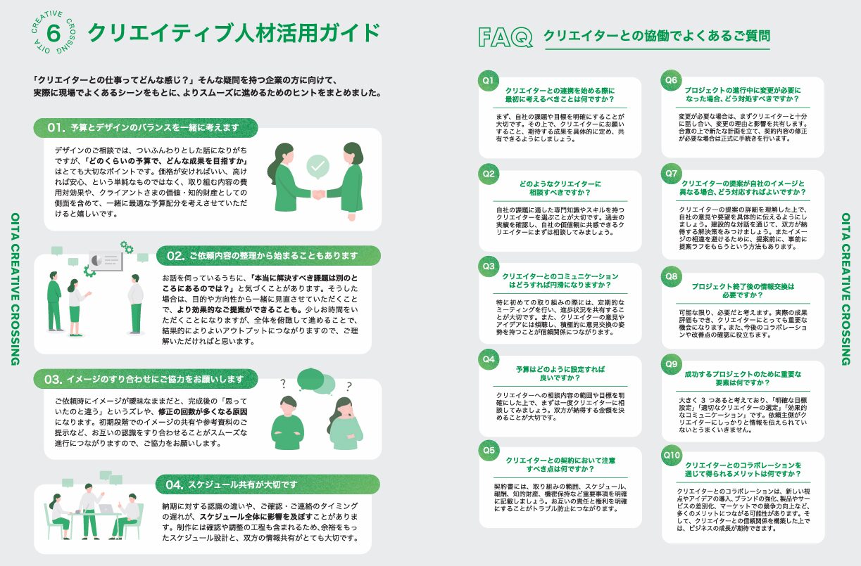 さらに、クリエイターへの依頼に慣れていない企業でも安心して一歩を踏み出せるよう、「予算とデザインのバランス」や「依頼内容の整理術」といったスムーズな連携のためのヒントや、よくある質問(FAQ)も網羅されています。